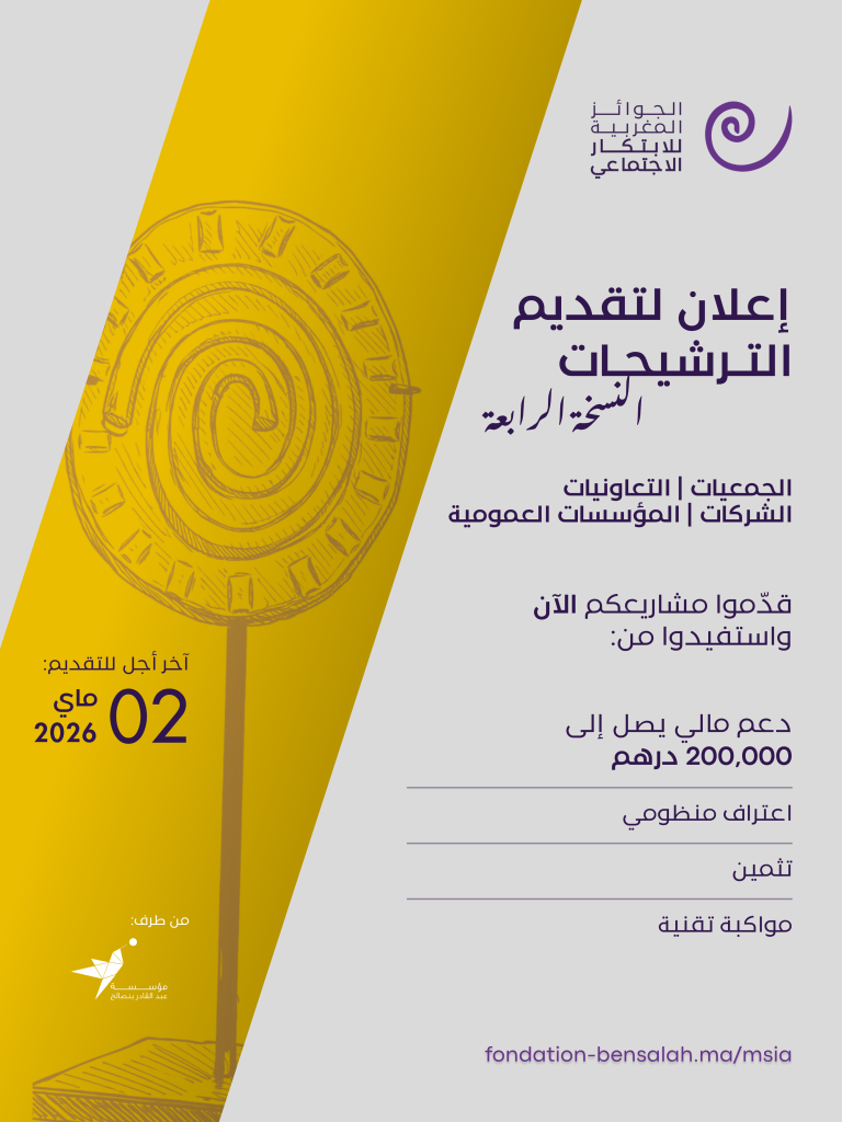 تعلن مؤسسة عبد القادر بنصالح عن فتح باب الترشيحات للمشاركة في النسخة الرابعة من الجوائز المغربية للابتكار الاجتماعي (MSIA)، وهي مبادرة وطنية أُطلقت سنة 2023 بهدف الاعتراف سنويًا بالمبادرات والحلول المبتكرة ذات الوقع الاجتماعي القوي، التي أثبتت فعاليتها في مواجهة التحديات المجتمعية الكبرى التي يعرفها المغرب.